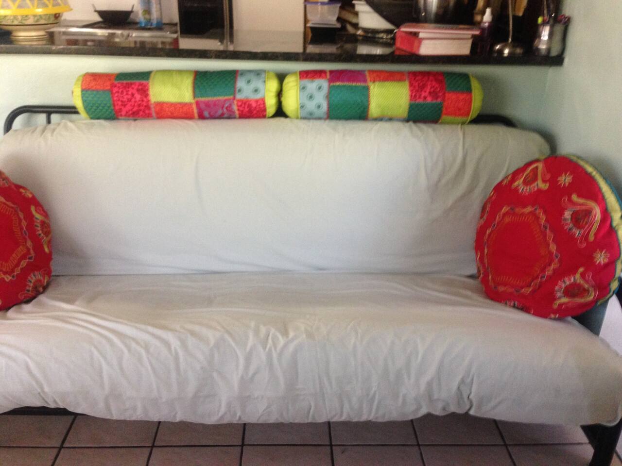 When you arrive at the address, there is a small black-iron gate that leads to the porch. There are two doors. The door straight-ahead is our door. The living room is a large space with a T.V. that has Directvnow streaming channels through a Roku device (there are TVs are in the master bedroom and back bedroom as well). The living room is used as a Yoga room equipped with yoga mats, cushions, blankets and straps. In case you want to watch T.V. in the living room, you may need to sit on cushions on the floor; or you may bring a chair from the other room. Our guests are welcome to use any of the food and other kitchen items. There are two bikes for guests use with helmets. There is also a full futon (queen size mattress) in the dining/office area. There are ceiling fans everywhere. There is a wall a/c in the master bedroom. In case you wish to cool the whole house, please close all windows and the back french door by the dining area. The back Florida room is cooler.